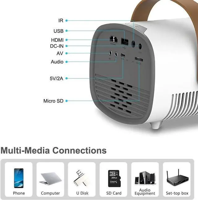 The small projection is compatible with TV box , laptop, U drives, DVD player to play cartoon, movie and display photos. It also can be easily connected the to enjoy big game.