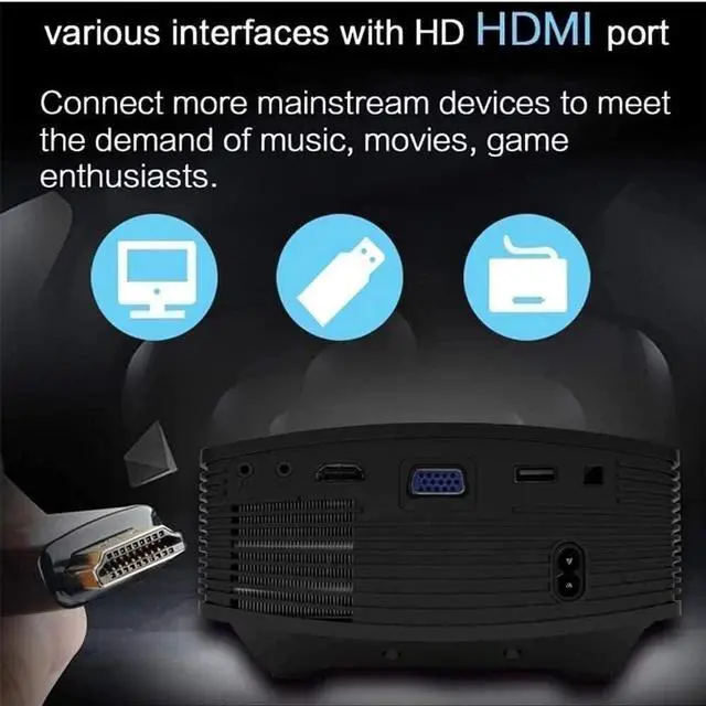 [Multimedia projector with flexible connectivity]Video projector has AV/USB/SD/HDMI/VGA/Headphone plug which allows you to play most media players on it like PCs, Macs, video games like PS3/Xbox, blue-ray DVD player, TV stick,