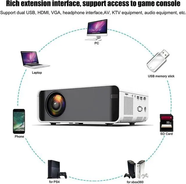 Rich expansion interfaces and support for access to game consoles. Support dual USB, HDMI, VGA / headphone interface, AV, KTV device, audio device, etc., to meet the fans of the projector.