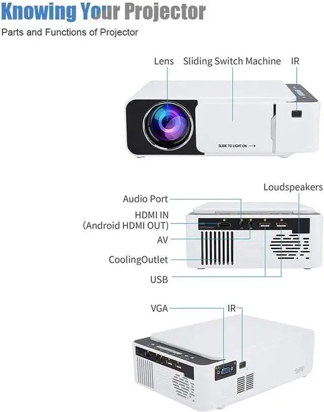 [Large screen viewing] The mini projector is equipped with LED lights, which can provide vivid and clear images, and is an ideal choice for home entertainment.
