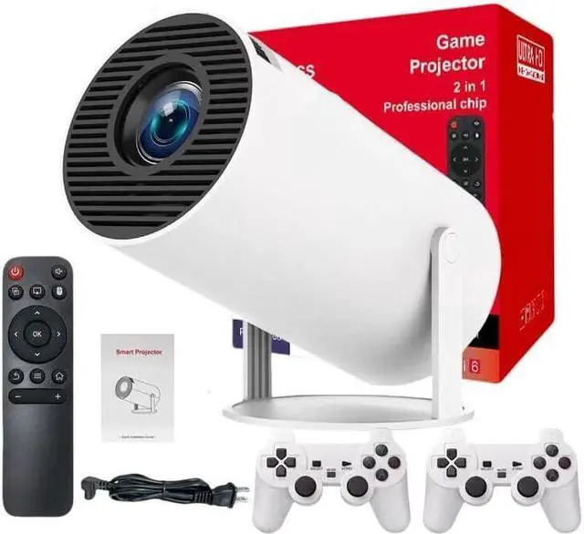 Portable Video Projector with Built-in 30,000+ Games & Dual Controllers - Plug the included USB controller into the projector and enjoy the game! The HY300 Pro isn't just another projector; it's a complete entertainment system featuring Android TV 11.0 and two wireless controllers. This game projector brings back childhood classics while streaming modern content, perfect for family game nights or solo retro gaming sessions.