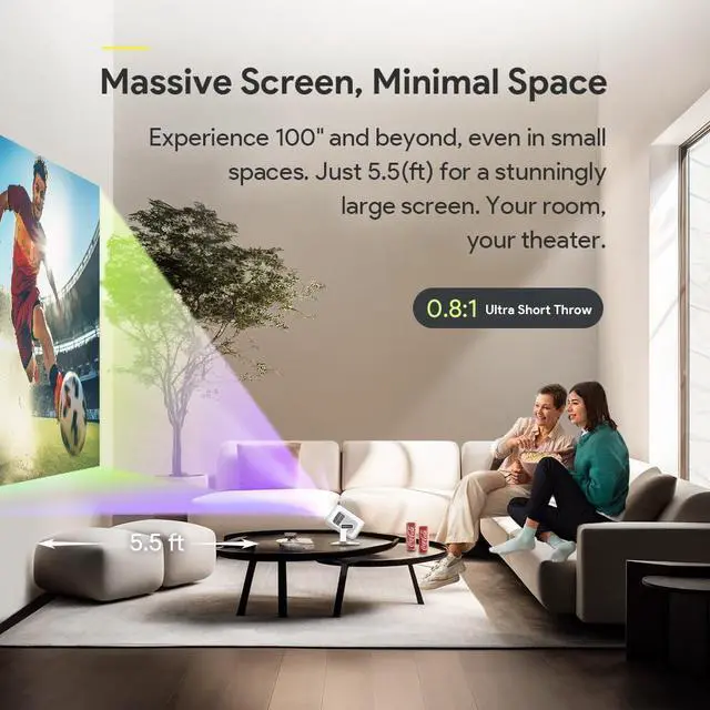 40"-130" Screen & 0.8:1 Ultra-Short Throw Ratio Ready to use right out of the box, the PJ300 Ultra is simple to operate with no technical experience required. Easily mirror your smartphone or laptop screen with its intuitive multi-language interface. The 0.8:1 ultra-short throw ratio allows you to project large, impressive images from just a short distance. Even in small spaces, you can achieve screen sizes from 40 to 130 inches without moving the projector far from the wall. This makes it perfect for bedrooms, apartments, or any compact rooms where space is limited, allowing you to enjoy a big-screen experience without the need for a large setup