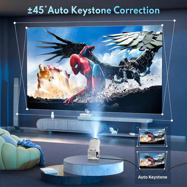±45° Auto Keystone Correction & Max 200" DisplaySay goodbye to manual adjustments! The smart projector offers ±45° Auto Keystone Correction, ensuring a perfectly aligned image from any angle. Immerse yourself in every detail and vibrant color on a max 200 screen display, creating unforgettable movie nights or gaming sessions.