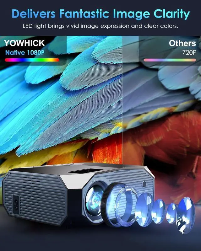 4K Support & Native 1080PYOWHICK smart movie projector equipped with real native 1920*1080 resolution. We upgraded our DP03 with a high contrast ratio and brightness to better meet your needs. A 6-layer high refractive index coated lens restores the true color of the picture, presenting high-definition picture quality to reduce eye irritation.
