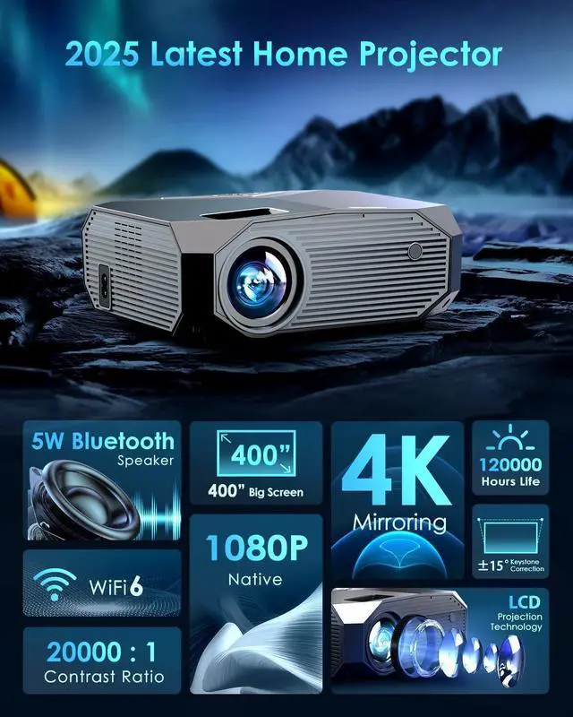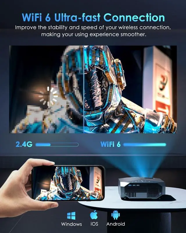 WiFi 6 & Bluetooth 5.3With latest dual-band WiFi 6 and 2.4G Connection, YOWHICK projector with WiFi and bluetooth enables you to have much smoother and lag-free online video streaming and gaming online experience when sync smartphone screens. Bluetooth5.3 support achieves you various Bluetooth speakers and headphones immersive sound experience