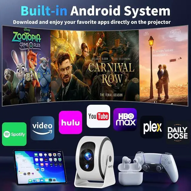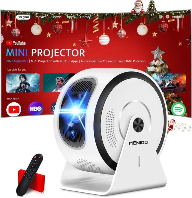 [Built-in Apps & 2026 Upgraded Mini Projector] MENIOO projector experience a world of entertainment with over 4000 apps at your fingertips, including access to popular streaming platforms like, Prime Video, YouTube, and more. Smart projector is equipped with built-in smart Android TV OS, you can access millions of videos without using an additional TV stick. A vast library of video content at your fingertips, effortlessly catering to diverse needs such as watching films, binge-watching series, gaming, and presentations. Enjoy your very own movie night in the comfort of your own home!