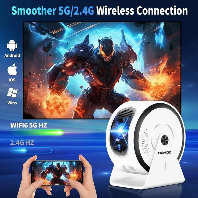 [360° Rotation for Flexible Projection Angle Adjustment] This 4K MENIOO video projector features a 360° rotatable gimbal base, breaking free from traditional fixed-angle constraints. Adjusting the angle requires no movement of the projector itself; simply tilt the unit to project images onto any wall or ceiling surface within the room. Perfect for cozy bedrooms, kids story time, dorms, or any small space where flexibility is key
