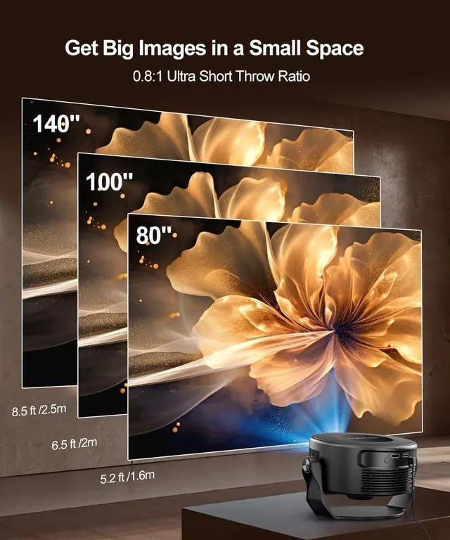 Ultra-Short Throw Projection: This video projector features a 0.8:1 throw ratio, for the optimal viewing experience, we recommend maintaining a distance of 5.2 feet from an 80-inch screenseamlessly integrating into any space and delivering truly immersive, cinema-like viewing right in your home.