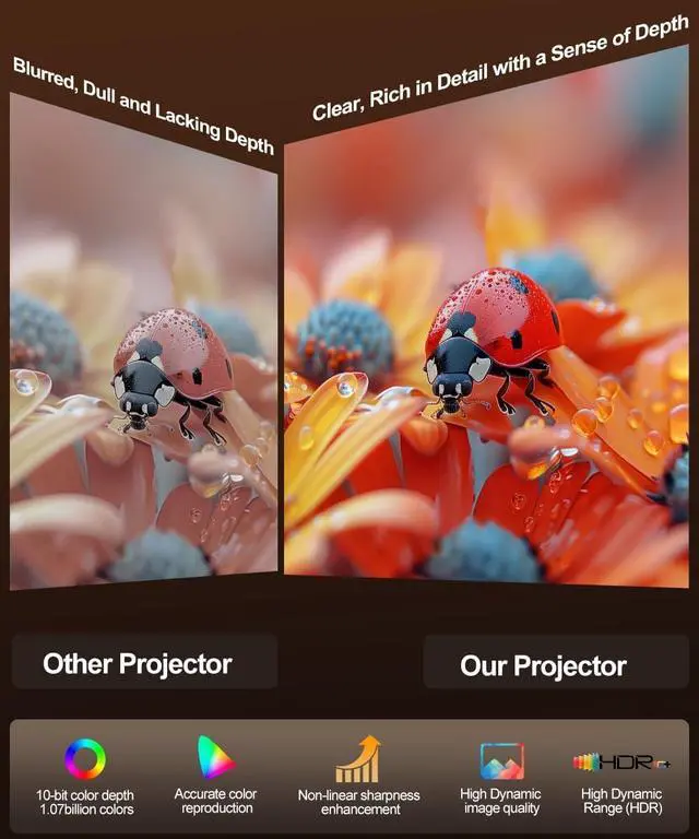 High-Definition Visual Feast: Our portable projector features true brightness of 260 ANSI lumens and 720P resolution, with support for 4K/8K decoding, delivering crystal-clear and vivid visual performance. It boasts a 10,000:1 high contrast ratio, 10-bit color depth and 1.07 billion colors, and is paired with non-linear sharpness enhancement technology and high dynamic range (HDR) to further enhance image quality delivering exceptional clarity, realistic color reproduction, and lifelike details. Whether youre watching action-packed blockbusters or playing visually stunning games, it immerses you in a stunning world where colors and details come alive.