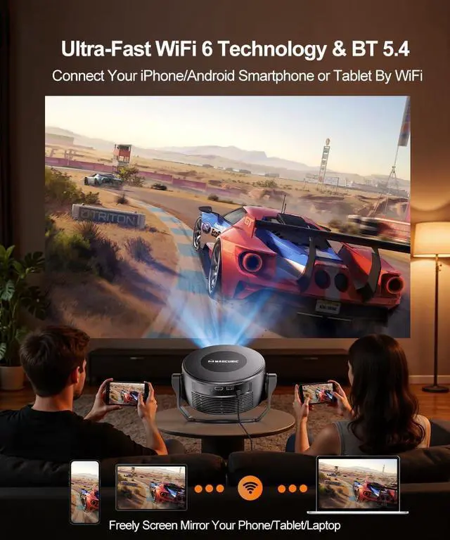 Strong Connectivity: Built-in 5W high-fidelity speakers deliver powerful, rich sound. Bluetooth 5.4 technology enables seamless connectivity with wireless headphones and external speakers. Next-generation dual-band Wi-Fi 6 (2.4G + 5G) ensures more stable and faster connections. With HDMI latency as low as 4ms, motion blur is eliminated, enabling native lossless transmission and direct signal-to-screen response. Every frame remains fluid and sharp, offering an immersive experience without lagmaking this Magcubic projector the ideal choice for home theater, gaming, and outdoor entertainment.