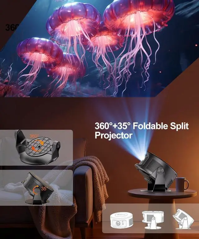Portable & Foldable Split Design: Our mini projector features a flexible, foldable, and detachable design. The main body and the base can be used separately. You can carry the main body alone to enjoy mobile entertainment anytime, anywhere, or connect it to the base for free-form projection. It is compact and portable, making it an excellent choice for both camping movie nights and on-the-go office work