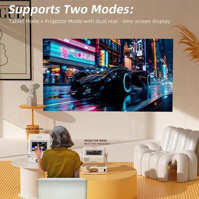 Unique Touchscreen DesignTwo modes available, easily switch between: Tablet + Projector. XBJ portable projector with a built-in touchscreen! Easily toggle between the interactive smart panel (for quick settings/navigation) and projecting a massive 30300" screen on walls, ceilings, or tents. Perfect for family movie nights, kids learning games, backyard movie, business presentations.