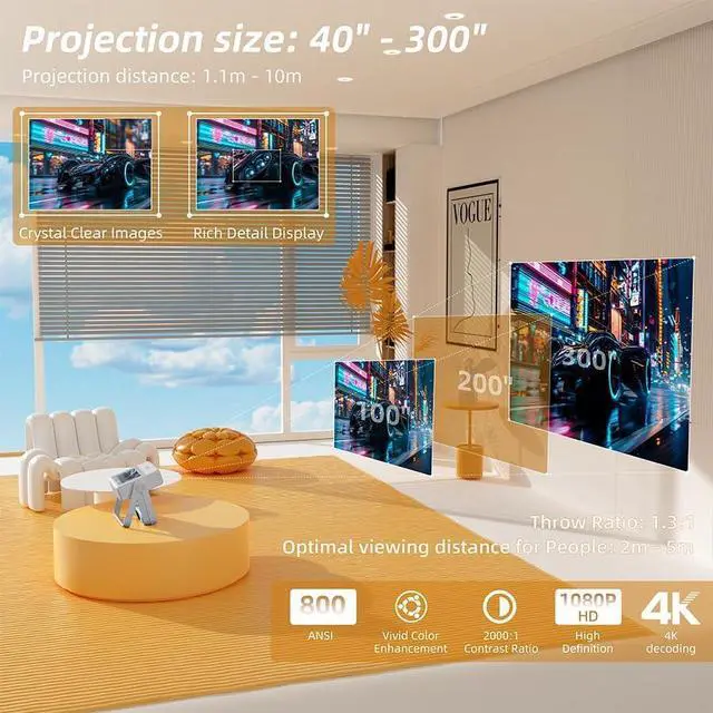 Native 1080P + 4K DecodingXBJ movie outdoor projector. Experience native 1080P Full HD clarity enhanced by 4K decoding support, delivering razor-sharp images (800 ANSI lumen). Auto-focus and auto-keystone correction. The 1.3:1 throw ratio creates 100" screens from 8.8ft - ideal for backyard camping trips or RV adventures.