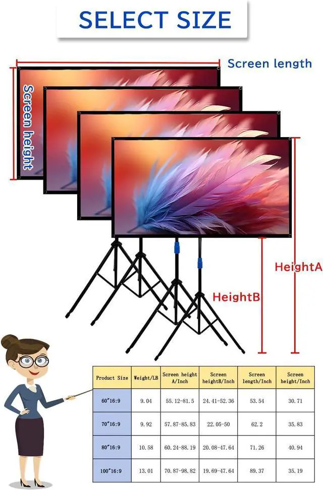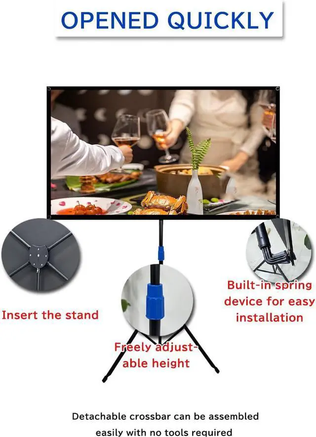 90-second rapid deployment You can,quickly assembling all parts just in a few simple steps, then you will get a stable and flat screen with a sturdy frame, and the 9.8-pound ultra-portable design can be stored in a 20-inch × 5-inch shockproof storage tube and comes with an ergonomic shoulder strap.