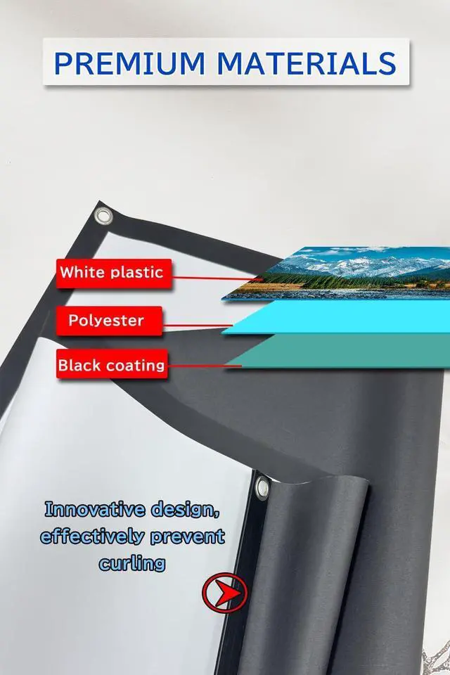 Full-environment theater experience The IPX4 waterproof surface effectively resists rain/fog during backyard screenings, and the fiberglass core prevents thermal expansion in high desert temperatures. The 16:9 screen ratio is optimized for 60-inch to 100-inch projectors, provides a 160° viewing angle, and supports 25 viewers to watch simultaneously in the living room, rooftop or campsite.