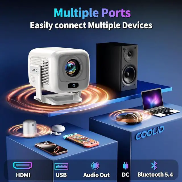 WiFi 6 and Bi-directional Bluetooth 5.4The Coolid C3 mini projector features Bluetooth 5.4 and WiFi 6 dual-band technology (2.4GHz and 5GHz), making it easy to connect multiple devices with the latest upgrade. With bi-directional Bluetooth 5.4 audio transmission, you can connect Bluetooth headphones or speakers to use it as a stereo in standby mode and with built-in 360° surround sound for a cinema-quality audio experience. Enjoy seamless entertainment with ease.