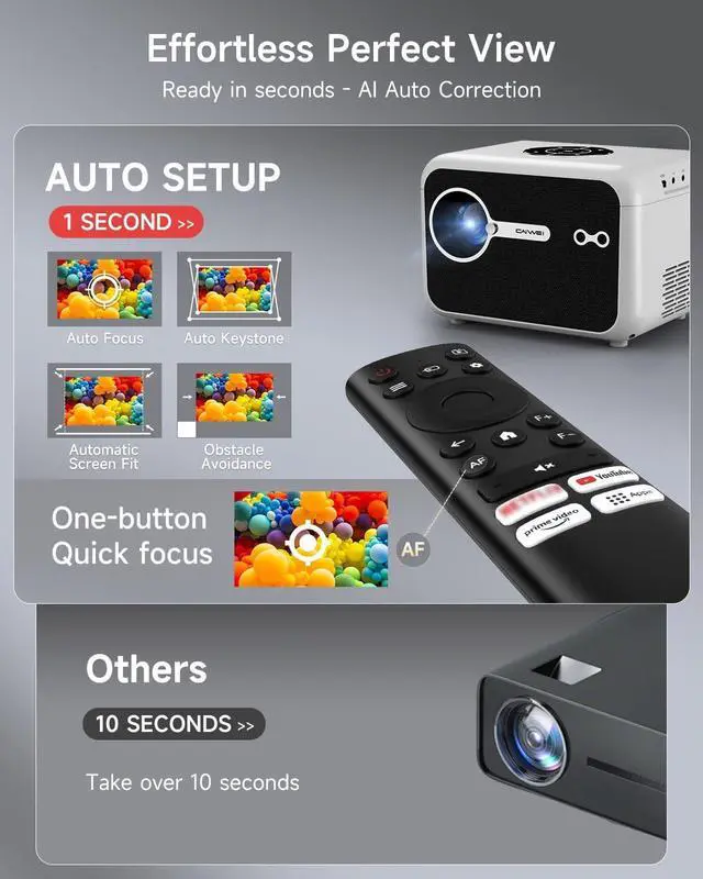 Instant Auto Focus & Effortless SetupGet a perfectly sharp picture in seconds. As a true auto focus projector, it combines instant one-touch focus with full auto keystone and screen alignment. This smart projector makes setup on any surface quick and effortless.
