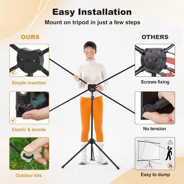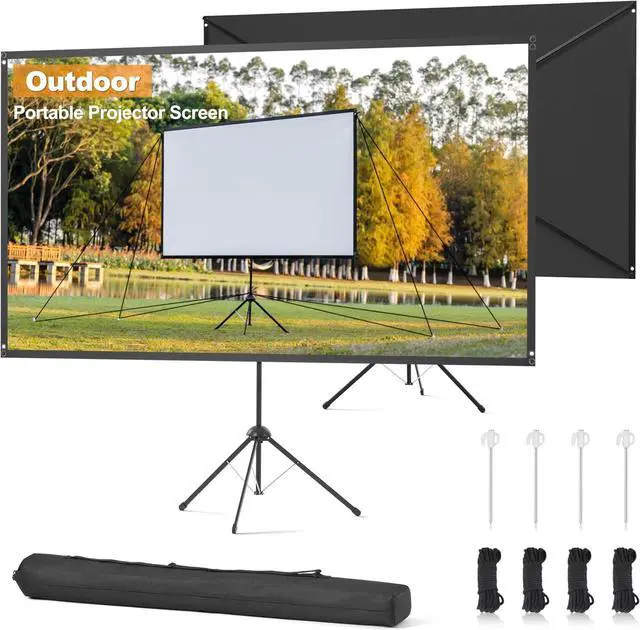 Projector Screen with Stand. Mounting this projector screen with tripod would be very easy and fast, you won't need other tools or do any screwing, quickly assembling all parts just in a few simple steps, then you will get a stable and flat screen with a sturdy frame and wider tripod stand supported, the outdoor kits makes it more sturdy and wind resistant outdoors.