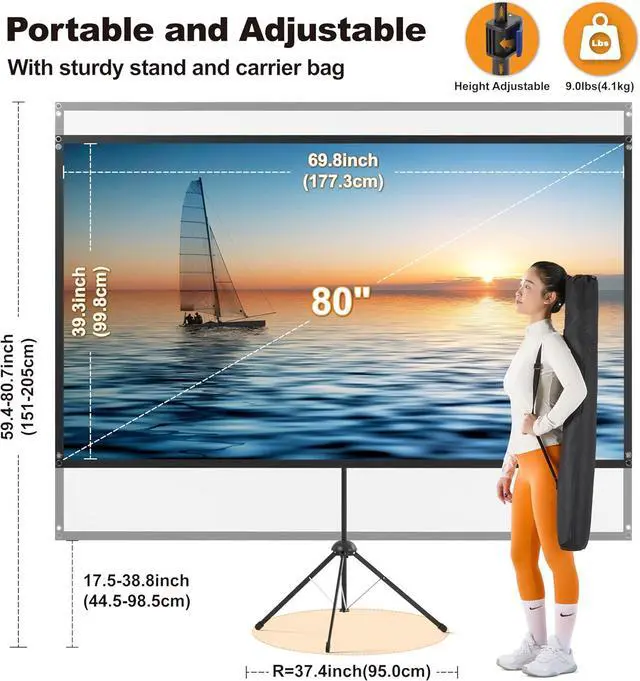 Portable Projector Screen. The aluminum arms keeps the weight of the entire screen down, the buckle in the middle of the support rod easily to adjust the height of screen while shorter the storage size of the tripod stand after its wider legs retracted, all parts are designed in a size that can be suitable for carrying with a carrier bag that just fits well.