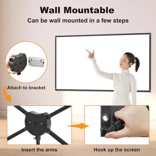 Wall and Rope Mounting. Also it can be a projector screen indoor.You can mount the projector screen on a wall using the included wall bracket, or you can secure the screen to an immovable object, such as a tree, by tying the four corners of the screen with ropes.