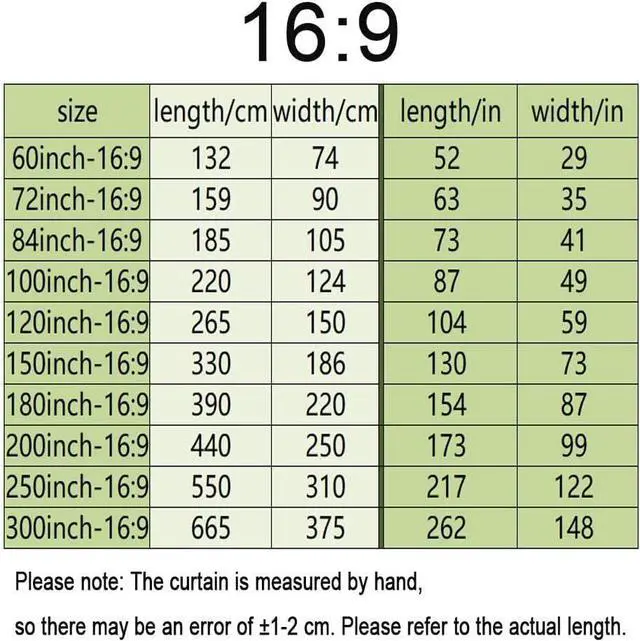 Size: 60 inches / 72 inches / 84 inches / 92 inches / 100 inches / 120 inches / 133 inches / 150 inches / 200 inches / 250 inches / 300 inches