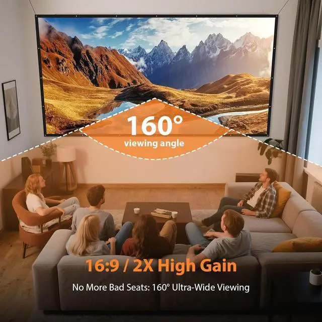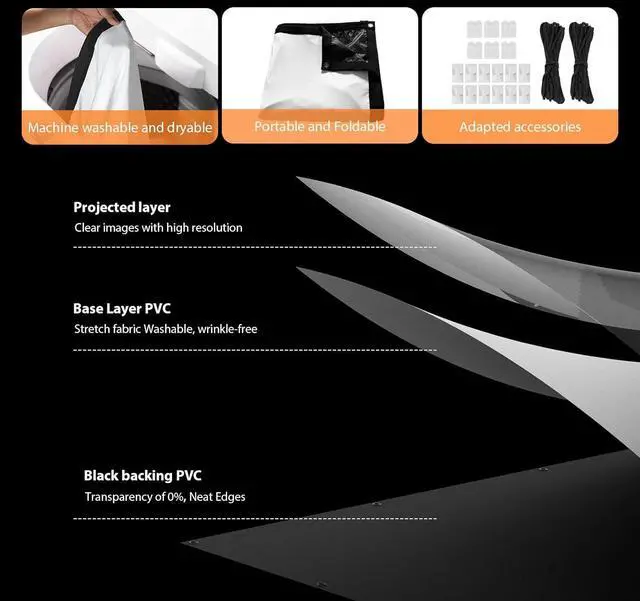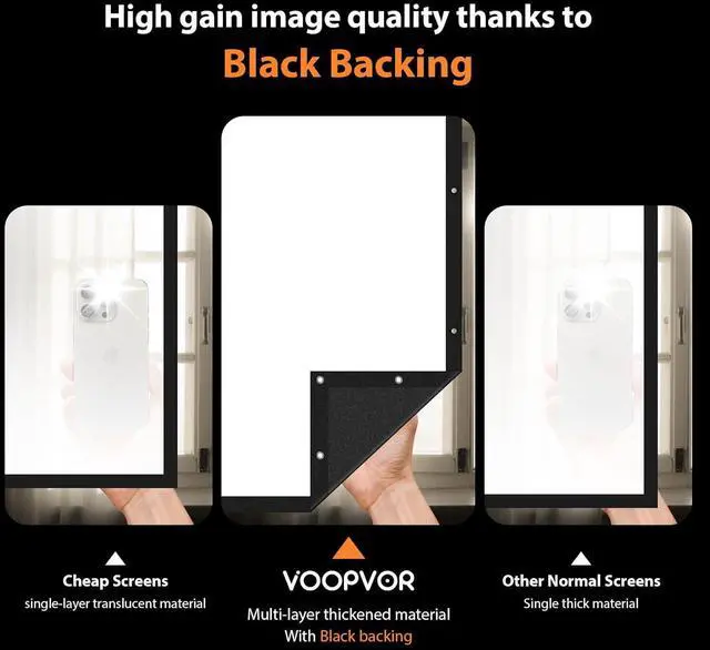 Wrinkle-free projection screenVOOPVOR projection screen, the back of the opaque black background, the projection screen is made of 200 grams of polyester milk silk, 16:9 format, 160 ° wide viewing angle, good projection effect, will be fixed in place after the full unfolding can be wrinkle-free, washable, foldable, can also be used as a blackout cloth in summer
