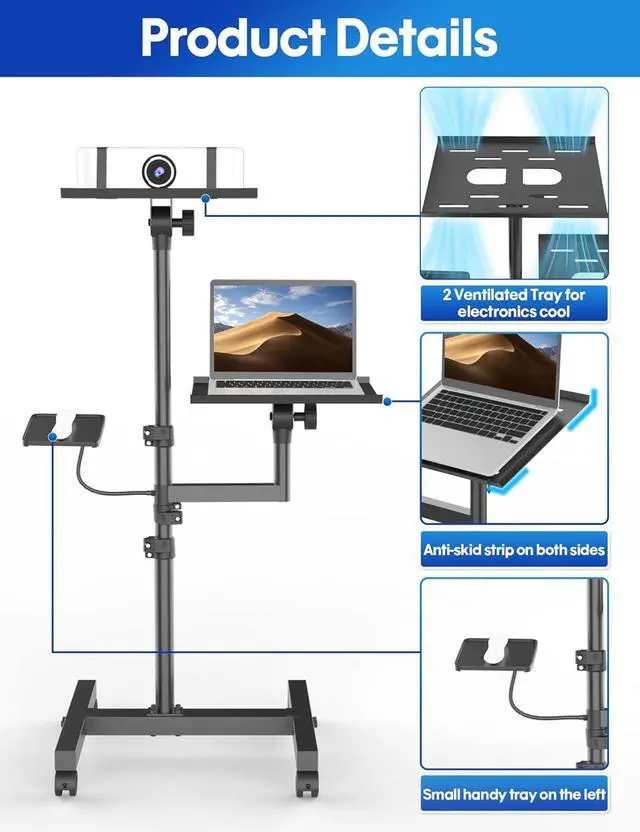 Effortless Mobility with Lockable Casters:The mobile projector and laptop stand is equipped with 4 high-quality silent casters that can rotate 360°. The front two casters can be locked, ensuring convenient mobility and excellent stability, thus enabling easy adjustment and fixation of the position.