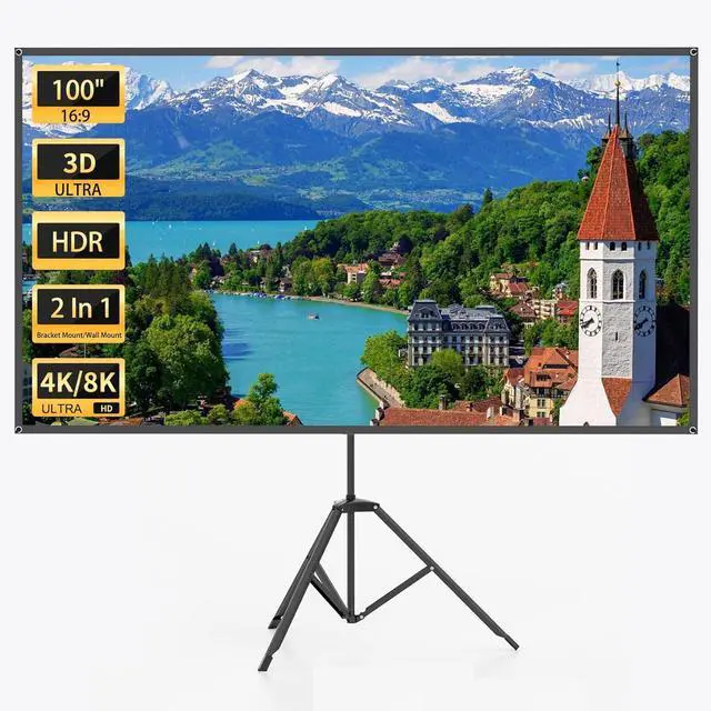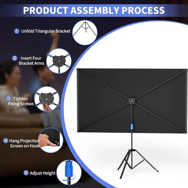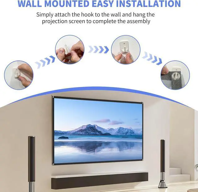 Projection Screen 2 IN 1: The projection screen has two installation modes, you can install it with a tripod, or you can mount the projection screen on the wall, simple steps to get two modes