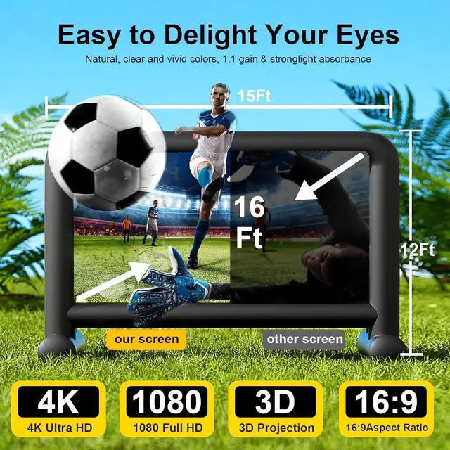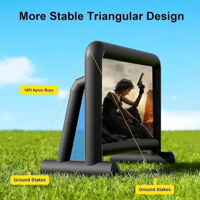 100% 210T Reinforced Nylon Fabric:The inflatable projector screen made of high-density 210T nylon material, resists tearing, UV fading, and abrasion, providing 3X longer lifespan than standard PVC screens