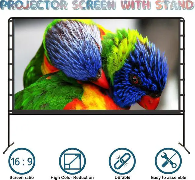 Projector screen with stand: Premium mental material makes the projector screen stand, durable frame can be quickly installed into a rectangle with a button, very flat. Comes with extra nylon cables for better stability, with it you don't need to worry about wobble.
