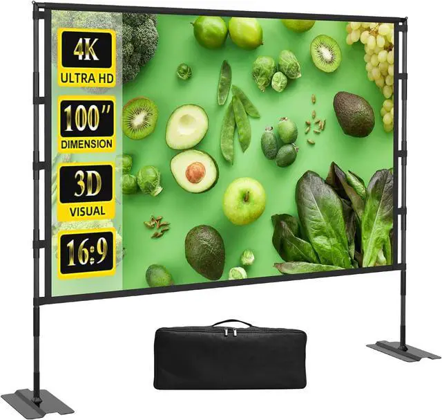 OUTDOOR PROJECTOR SCREENThis 100-inch portable projector screen with a 16:9 format, 1.0 gain, and a 160° wide viewing angle is designed to deliver an exceptional viewing experience. Made from soft polyester fabric, the screen stretches tightly across the frame, ensuring a smooth, ripple-free projection surface. Compared to older models, this HUANYINGBJB projector screen offers higher contrast and brighter colors, enhancing the overall image quality. The black backing fabric effectively blocks light from behind, further improving picture clarity. Definitely a must-have for movie nights!