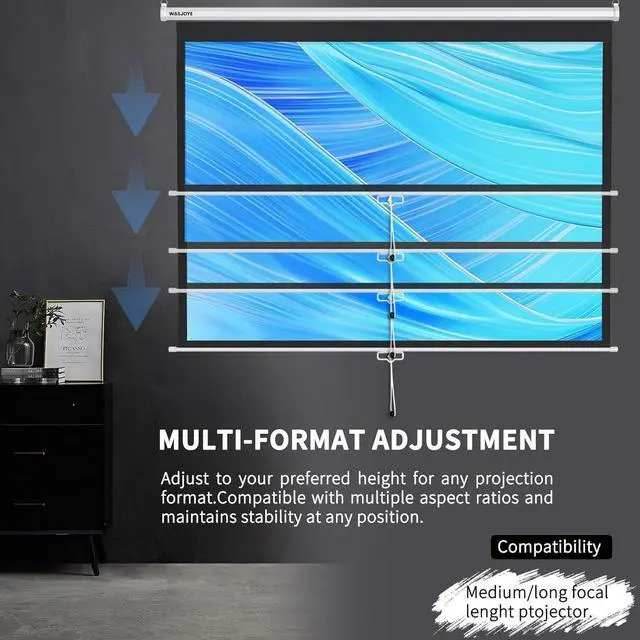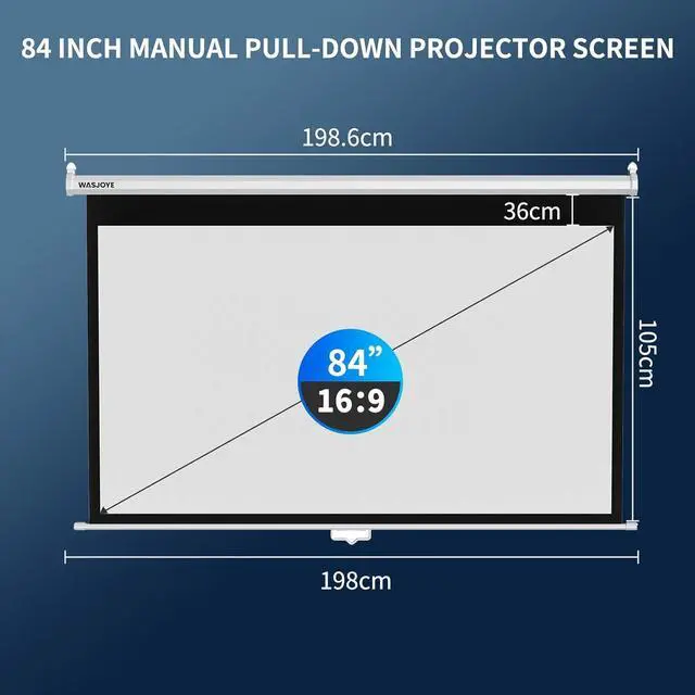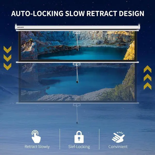 Manual PULL DOWN PROJECTOR SCREEN : The manual pull-down screen adopts a self-locking torsion spring designFully retractable, just pull the screen down, it will automatically lock in the specified positionthe rotating structure is sealed and dust-proof, and durable
