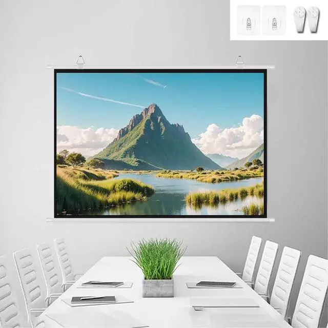 The projector screen has two installation methods: wall hanging and hole-punching. It comes with 2 adhesive hooks and 2 nails, which can be quickly installed and used, and can be applied to walls of different materials.