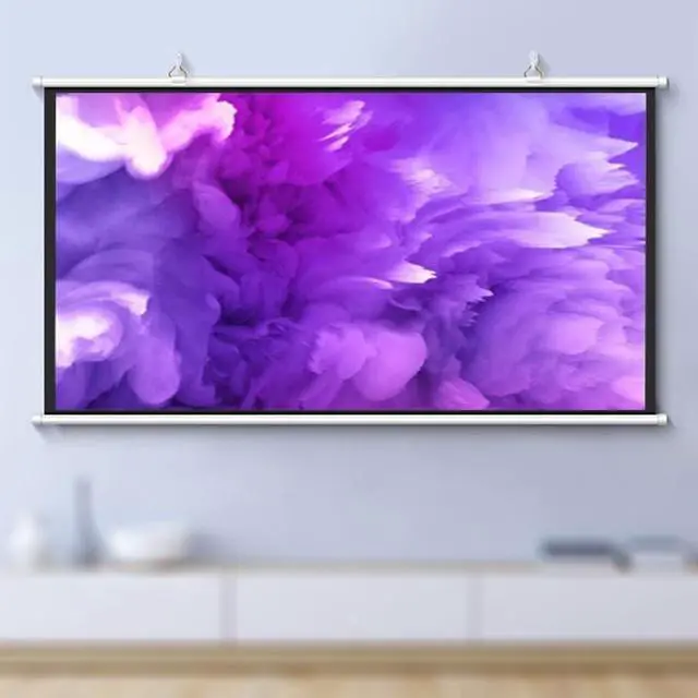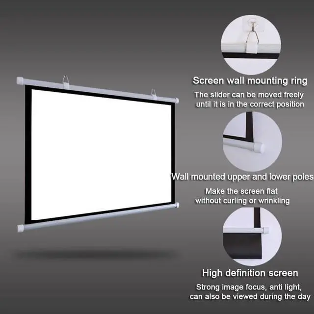 SCREE WALL HANGING RING: can move the hook position freely; Wall mounted upper and lower poles: make the screen flat without curling or wrinkling; High definition screen: Strong image focus, anti light, can also be viewed during the day