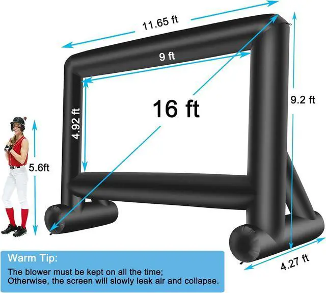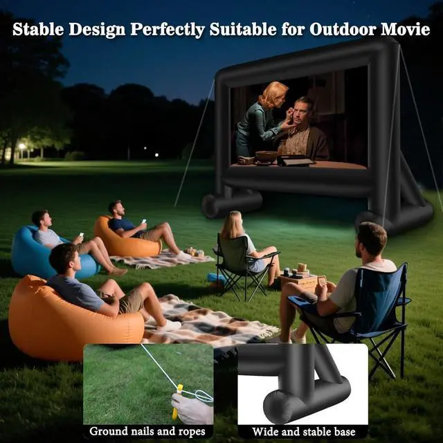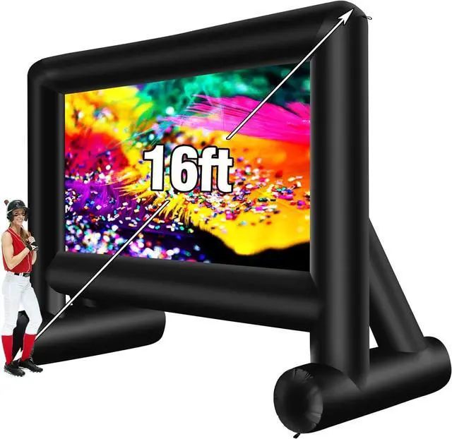 [DURABLE MATERIAL] This inflatable projector screen is high-quality polyester materials, it is flexible, safe and smooth, without traces and no crease after folded. 210D Oxford cloth black frame features a seam-free, super stable and durable for use in all seasons. Easy to maintain and washable.