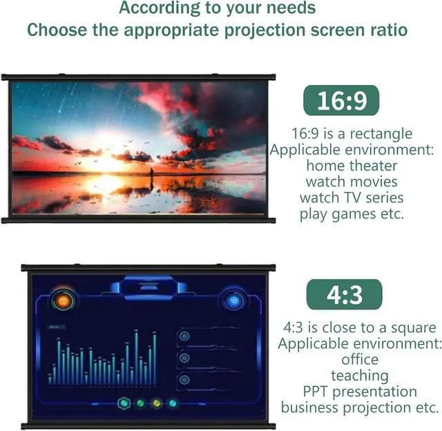 Projector screen multiple sizes available, 30/40/50/60/72 inches diagonal, screen aspect ratio 16:9 and 4:3 optional, with the best image and colour reproduction for your perfect visual enjoyment.