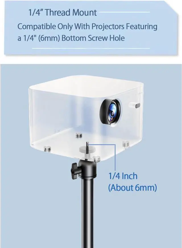 Stable Projector StandThis floor projector stand is made of high-quality carbon steel, Stainless coating, Anti-shake Design and Thickened Tube with a loading capacity 11 lbs /5 kg. (Note: Compatible only with projectors featuring a 6mm bottom center screw hole. Please check before purchasing.)
