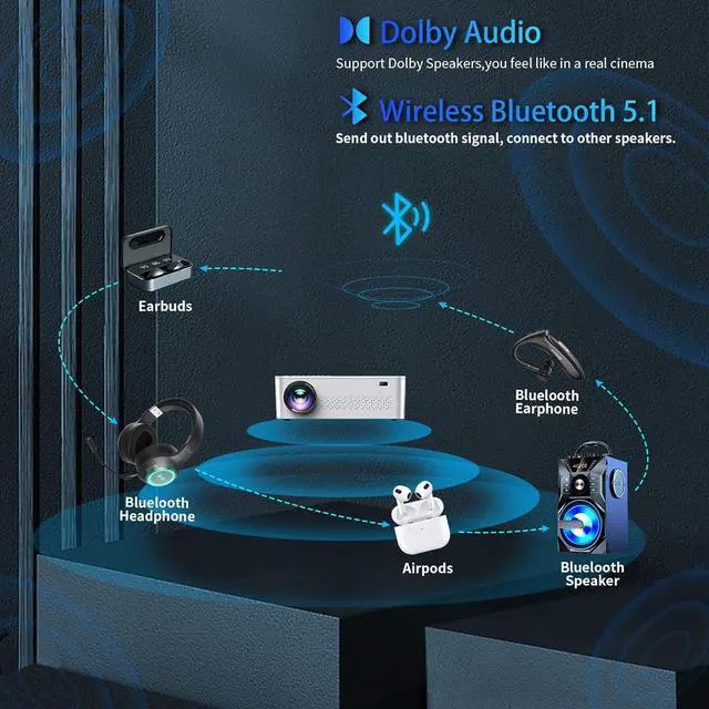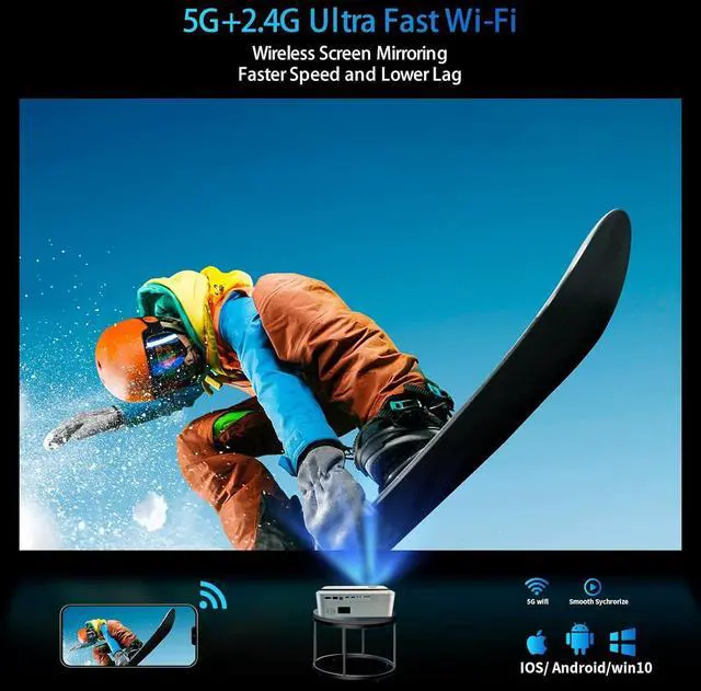 Innovative 5G WiFI Connection & Bluetooth 5.1 Function:WiFi projector enables synchronize smartphone screen by breathtaking WiFi. Ultra-fast 5G WiFi allows fluid streaming experience for gaming online and seamless video streaming. The wireless screen sharing function offers convenience to watch all your favorite content by streaming from iOS or Android devices. Outdoor projector built-in Bluetooth 5.1 chip which can connect your Bluetooth speaker wirelessly any time freely