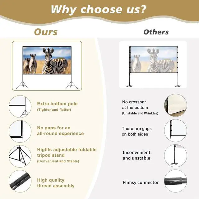 Wrinkle-Free and Flat Surface:The fully wrapped, square-structured design eliminates annoying wrinkles and curls, providing a smooth and flat projection surface.