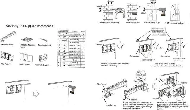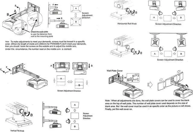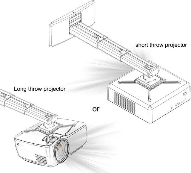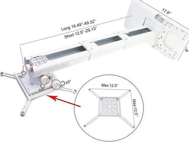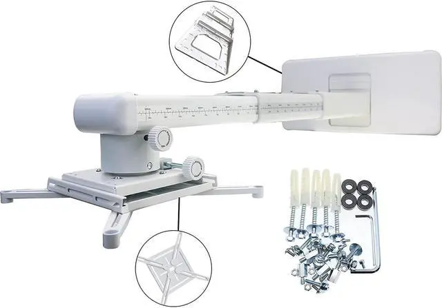 The mounting plate of the projector bracket has four adjustable and freely retractable horizontal axis mounting arms, which is a universal mounting bracket for ultra short distance projectors. The maximum distance between mounting holes on the back of the projector must be less than 12.5 inches.