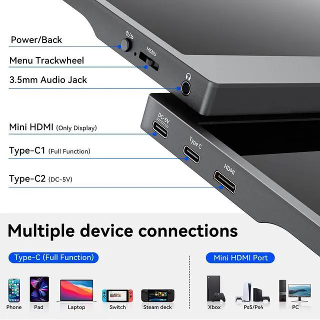 USB C And HDMI Plug And PlayFeaturing dual USB C and a mini HDMI port, this portable monitor hdmi connects quickly to laptops, PCs, phones, and consoles. A single USB C cable can deliver power and display, making it an efficient laptop screen extender or external monitor for laptop users.