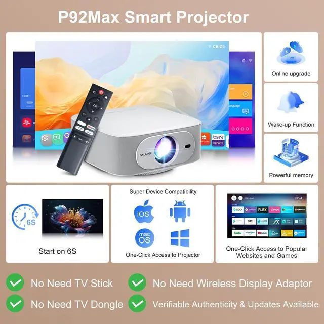 2025 New Smart Projector with Apps Built in - Do not need extra devices, one-click access to Prime Video, YouTube and more videos, that completely solve the problem that other android projectors built-in apps often cannot run due to unofficial certification. Plus, explore endless entertainment from hundreds of built-in app or watching videos online with features like 'My App', 'APP STORE', and 'Open Browser'
