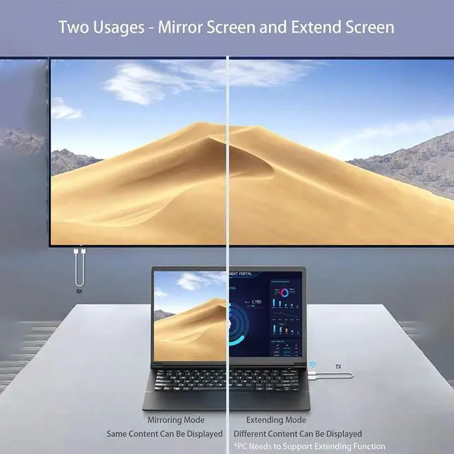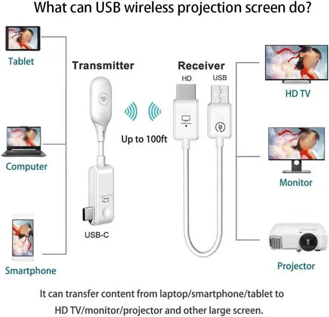 USB Wireless Projection Screen: 1. Wireless display is to mirror a small screen to a larger screen wirelessly. 2. Wireless Extend Screen is to extend laptop's screen to a second screen wirelessly. 2 in 1. Supports to cast screen from all devices with USB C interface such as smart-phones, Macbook, tablet, laptop, PC. Best for home theater, gaming, meeting, education, live broadcast, speech