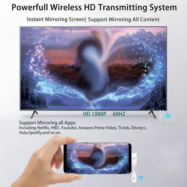 Realize Breakthrough and Innovation: This Wireless HD transmitter and receiver kit solves the limitation on encrypted apps. Supports to cast all content(in Wireless Display Mode) - what you see on your small screen, you see on your larger screen