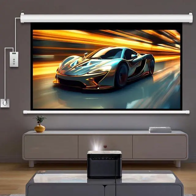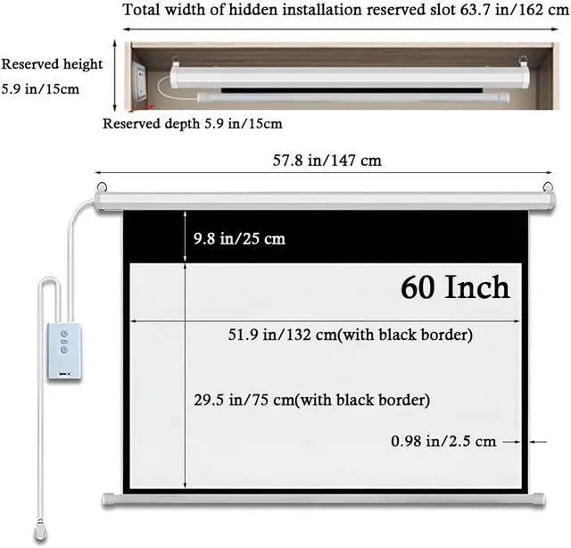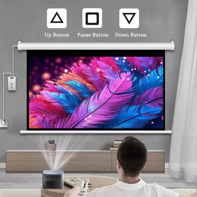 Motorized projector screen: pre-installed power cord, easy control via wired control box or included wireless remote