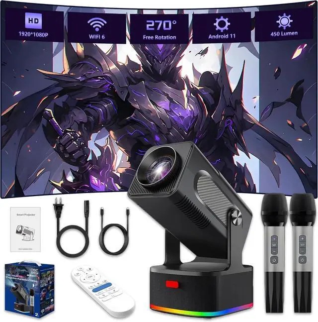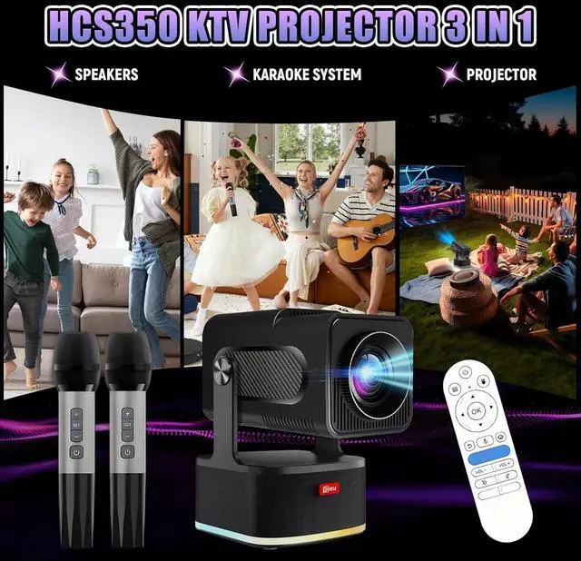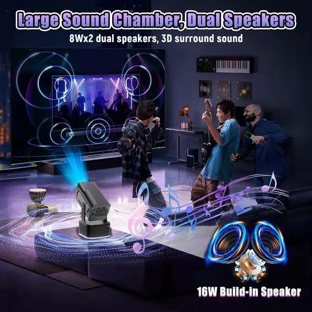 THREE MODES & 2*8W HIGH-POWER STEREO SPEAKERS: This small projector innovatively integrates three functionsAudio Mode, Karaoke Mode, and Projector Mode,featuring built-in 2*8W high-power stereo speakers for crisp, layered sound quality. Toggle to Audio Mode for instant high-quality desktop speakers; activate Karaoke Mode to transform your living room into a private KTV; engage Projector Mode for versatile movie viewing. Thoughtfully equipped with two rechargeable microphones, this 4k projector ensures stable, interference-free connections and extended battery life per charge,keeping the singing fun going with family and friends. One device, triple the experience