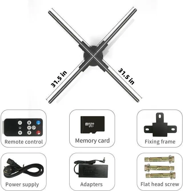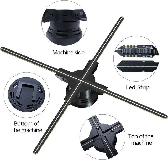 3D holographic fan utilizes the principle of the persistence of vision of the human eye, through the control of the chip, the LED lamp bead emits light at a fixed position, and combined with the high-speed rotation of the motor to form an image, so as to realize the visual effect of the projected object suspended in the air.