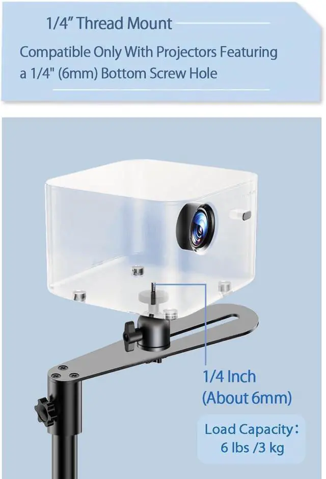 Compatibility Notice Please be aware that our projector stand is exclusively compatible with projectors featuring a 1/4" (6mm) bottom center screw hole. We kindly advise verifying your projector's specs before making a purchase.