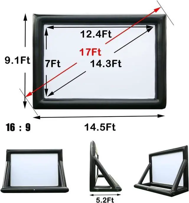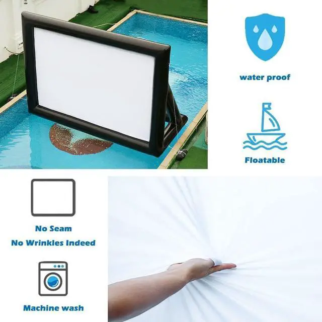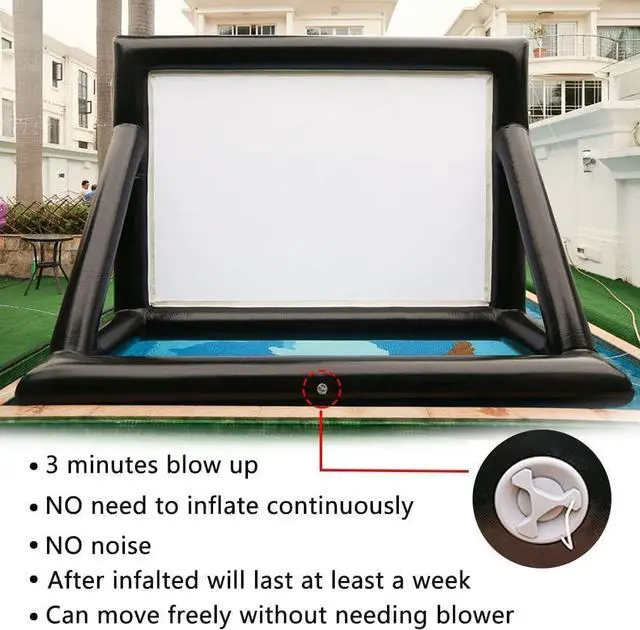 Durable PVC Frame Our movie screen features a sturdy PVC frame that doesn't require continuous inflation, eliminating the noise of fans while watching TV. Each inflation can last at least a week, allowing you to enjoy your movies without interruptions.