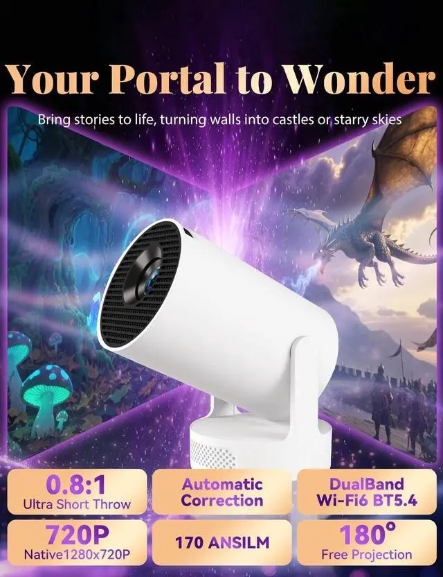Projector with Wifi & Bluetooth ConnectivityEnjoy smooth streaming with this projector with WiFi and Bluetooth 5.4, powered by WiFi 6 for low-latency performance. Mirror your screen, pair external speakers, or stream content effortlesslymaking the fantasy projector perfect for cozy movie nights or immersive reading sessions.